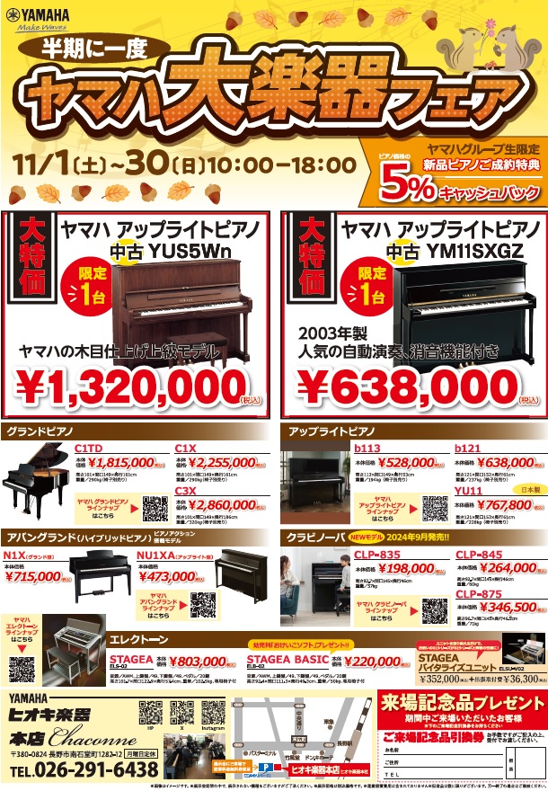 ヒオキ楽器では、11月1日から30日までの間、半期に一度開催の「ヤマハ大楽器フェア」を開催します。